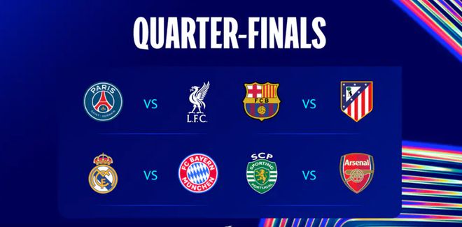 在昨日,第二回合淘汰赛“下半时”打完,晋级八强八队正式诞生。其中上半区汇集了巴黎、利物浦、皇马、拜仁这四支豪门,下半区是巴萨、马竞、葡萄牙体育、阿森纳四支队伍,相比之下下半区的难度比上半区是小了点的。